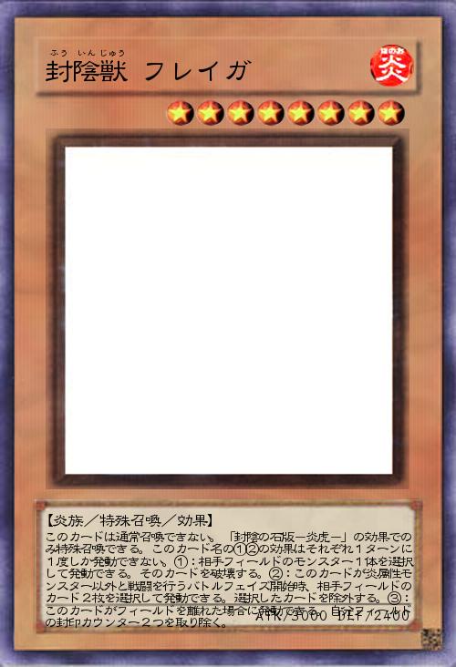| このカードは通常召喚できない。「封陰の石版-炎虎-」の効果でのみ特殊召喚できる。このカード名の①②の効果はそれぞれ1ターンに1度しか発動できない。①:相手フィールドのモンスター1体を選択して発動できる。そのカードを破壊する。②:このカードが炎属性モンスター以外と戦闘を行うバトルフェイズ開始時、相手フィールドのカード2枚を選択して発動できる。選択したカードを除外する。③:このカードがフィールドを離れた場合に発動できる。自分フィールドの封印カウンター2つを取り除く。 | |||