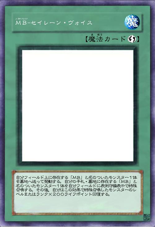 | 自分フィールド上に存在する「MB」と名のついたモンスター1体を墓地へ送って発動する。自分の手札・墓地に存在する「MB」と名のついたモンスター1体を自分フィールドに表側守備表示で特殊召喚する。その後、自分はこの効果で特殊召喚したモンスターのレベルまたはランク×200ライフポイント回復する。 | |||