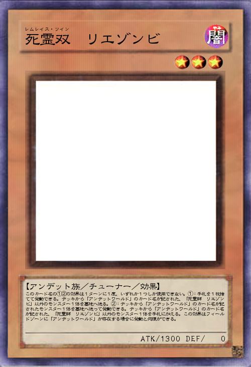 | このカード名の①②の効果は1ターンに1度、いずれか1つしか使用できない。①:手札を1枚捨てて発動できる。デッキから「アンデットワールド」のカード名が記された、「死霊師 リエゾンビ」以外のモンスター1体を墓地へ送る。②:デッキから「アンデットワールド」のカード名が記されたモンスター1体を墓地へ送って発動できる。デッキから「アンデットワールド」のカード名が記された、「死霊師 リエゾンビ」以外のモンスター1体を手札に加える。この効果はフィールドゾーンに「アンデットワールド」が存在する場合に発動と処理ができる。 | |||