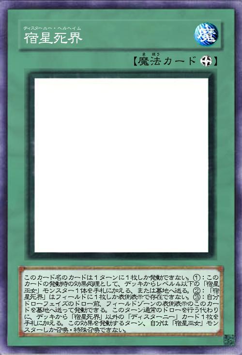 | このカード名のカードは1ターンに1枚しか発動できない。①:このカードの発動時の効果処理として、デッキからレベル4以下の「宿星巫女」モンスター1体を手札に加える、または墓地へ送る。②:「宿星死界」はフィールドに1枚しか表側表示で存在できない。③:自分ドローフェイズのドロー前、フィールドゾーンの表側表示のこのカードを墓地へ送って発動できる。このターン通常のドローを行う代わりに、デッキから「宿星死界」以外の「ディスターニー」カード1枚を手札に加える。この効果を発動するターン、自分は「宿星巫女」モンスターしか召喚・特殊召喚できない。 | |||