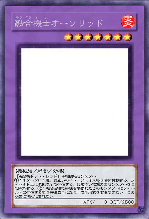 | 「融合機ドット・レッド」+機械族モンスター ①:1ターンに1度、お互いのバトルフェイズ終了時に発動する。フィールド上に表側表示で存在する、最も高い攻撃力のモンスターを全て除外する。②:融合召喚で特殊召喚されたこのモンスターはフィールドに存在する限り守備表示になり、表示形式を変更できない。この効果は無効化されない。 | |||