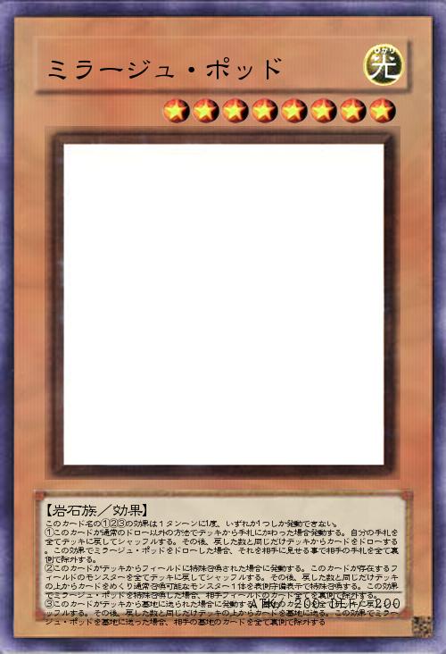 | このカード名の①②③の効果は1タンーンに1度、いずれか1つしか発動できない。 ①このカードが通常のドロー以外の方法でデッキから手札に加わった場合発動する。自分の手札を全てデッキに戻してシャッフルする。その後、戻した数と同じだけデッキからカードをドローする。この効果でミラージュ・ポッドをドローした場合、それを相手に見せる事で相手の手札を全て裏側で除外する。 ②このカードがデッキからフィールドに特殊召喚された場合に発動する。このカードが存在するフィールドのモンスターを全てデッキに戻してシャッフルする。その後、戻した数と同じだけデッキの上からカードをめくり通常召喚可能なモンスター1体を表側守備表示で特殊召喚する。この効果でミラージュ・ポッドを特殊召喚した場合、相手フィールドのカード全てを裏側で除外する。 ③このカードがデッキから墓地に送られた場合に発動する。墓地のカードを全てデッキに戻しシャッフ | |||