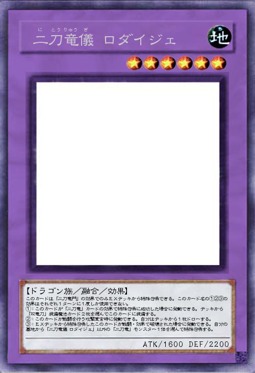 | このカードは「二刀竜門」の効果でのみEXデッキから特殊召喚できる。このカード名の①②③の効果はそれぞれ1ターンに1度しか使用できない。 ①:このカードが「二刀竜」カードの効果で特殊召喚に成功した場合に発動できる。デッキから 「双竜刀」装備魔法カード2枚を選んでこのカードに装備する。 ②:このカードが戦闘を行う攻撃宣言時に発動できる。自分はデッキから1枚ドローする。 ③:EXデッキから特殊召喚したこのカードが戦闘・効果で破壊された場合に発動できる。自分の墓地から「二刀竜儀 ロダイジェ」以外の「二刀竜」モンスター1体を選んで特殊召喚する。 | |||