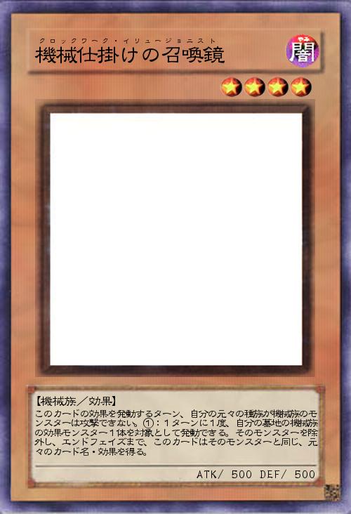 | このカードの効果を発動するターン、自分の元々の種族が機械族のモンスターは攻撃できない。①:1ターンに1度、自分の墓地の機械族の効果モンスター1体を対象として発動できる。そのモンスターを除外し、エンドフェイズまで、このカードはそのモンスターと同じ、元々のカード名・効果を得る。 | |||