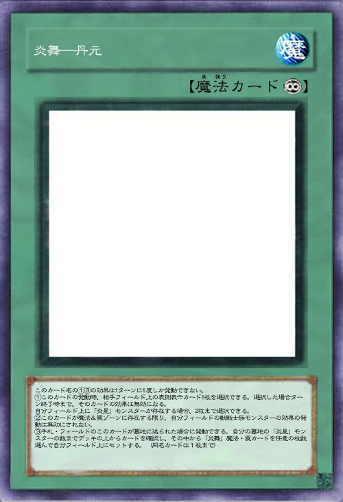 | このカード名の①③の効果は1ターンに1度しか発動できない。 ①このカードの発動時、相手フィールド上の表側表示カード1枚を選択できる。選択した場合ターン終了時まで、そのカードの効果は無効になる。 自分フィールド上に「炎星」モンスターが存在する場合、2枚まで選択できる。 ②このカードが魔法&罠ゾーンに存在する限り、自分フィールドの獣戦士族モンスターの効果の発動は無効にされない。 ③手札・フィールドのこのカードが墓地に送られた場合に発動できる。自分の墓地の「炎星」モンスターの数までデッキの上からカードを確認し、その中から「炎舞」魔法・罠カードを任意の枚数選んで自分フィールド上にセットする。(同名カードは1枚まで) | |||