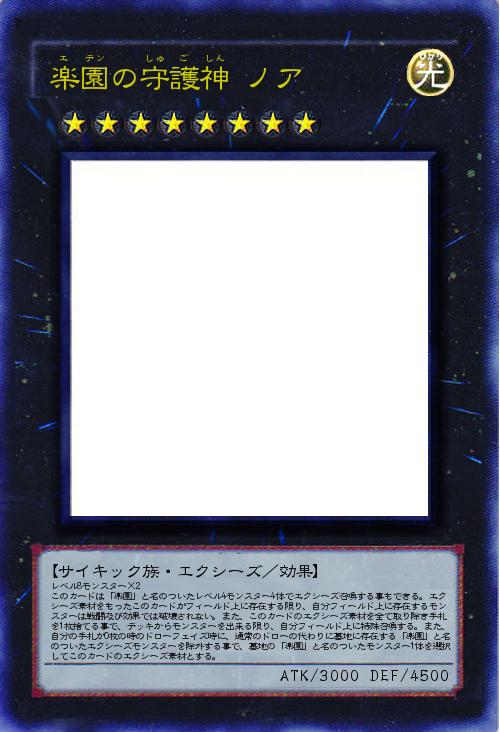 レベル8モンスター×2 このカードは「楽園」と名のついたレベル4モンスター4体でエクシーズ召喚する事もできる。エクシーズ素材をもったこのカードがフィールド上に存在する限り、自分フィールド上に存在するモンスターは戦闘及び効果では破壊されない。また、このカードのエクシーズ素材を全て取り除き手札を1枚捨てる事で、デッキからモンスターを出来る限り、自分フィールド上に特殊召喚する。また、自分の手札が0枚の時のドローフェイズ時に、通常のドローの代わりに墓地に存在する「楽園」と名のついたエクシーズモンスターを除外する事で、墓地の「楽園」と名のついたモンスター1体を選択してこのカードのエクシーズ素材とする。 |