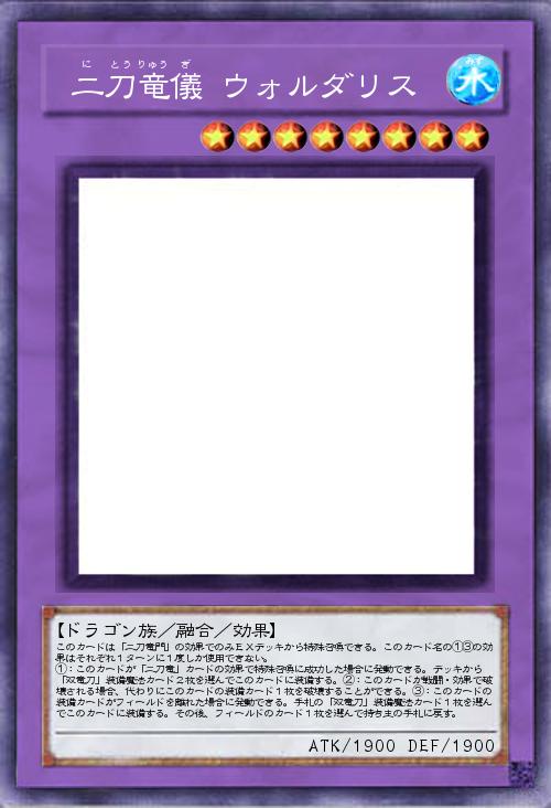 | このカードは「二刀竜門」の効果でのみEXデッキから特殊召喚できる。このカード名の①③の効果はそれぞれ1ターンに1度しか使用できない。 ①:このカードが「二刀竜」カードの効果で特殊召喚に成功した場合に発動できる。デッキから 「双竜刀」装備魔法カード2枚を選んでこのカードに装備する。②:このカードが戦闘・効果で破壊される場合、代わりにこのカードの装備カード1枚を破壊することができる。③:このカードの装備カードがフィールドを離れた場合に発動できる。手札の「双竜刀」装備魔法カード1枚を選んでこのカードに装備する。その後、フィールドのカード1枚を選んで持ち主の手札に戻す。 | |||