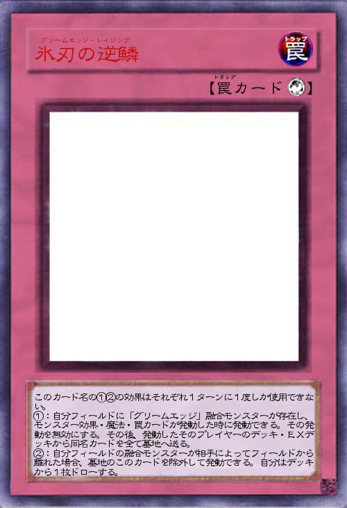 | このカード名の①②の効果はそれぞれ1ターンに1度しか使用できない。 ①:自分フィールドに「グリームエッジ」融合モンスターが存在し、モンスター効果・魔法・罠カードが発動した時に発動できる。その発動を無効にする。その後、発動したそのプレイヤーのデッキ・EXデッキから同名カードを全て墓地へ送る。 ②:自分フィールドの融合モンスターが相手によってフィールドから離れた場合、墓地のこのカードを除外して発動できる。自分はデッキから1枚ドローする。 | |||