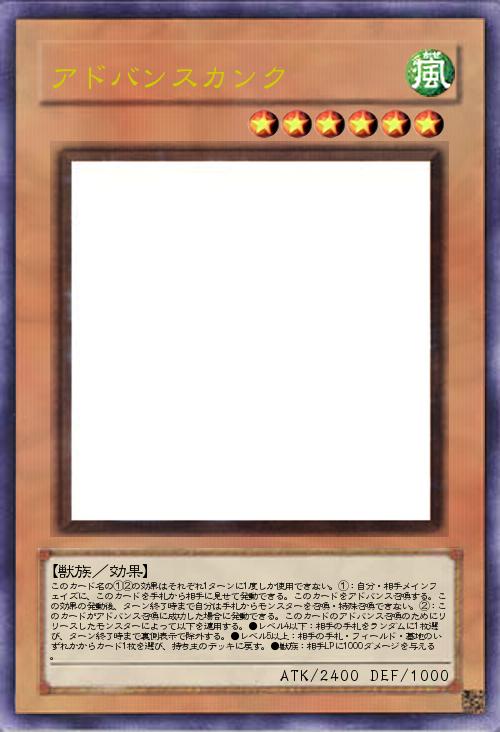 | このカード名の①②の効果はそれぞれ1ターンに1度しか使用できない。①:自分・相手メインフェイズに、このカードを手札から相手に見せて発動できる。このカードをアドバンス召喚する。この効果の発動後、ターン終了時まで自分は手札からモンスターを召喚・特殊召喚できない。②:このカードがアドバンス召喚に成功した場合に発動できる。このカードのアドバンス召喚のためにリリースしたモンスターによって以下を適用する。●レベル4以下:相手の手札をランダムに1枚選び、ターン終了時まで裏側表示で除外する。●レベル5以上:相手の手札・フィールド・墓地のいずれかからカード1枚を選び、持ち主のデッキに戻す。●獣族:相手LPに1000ダメージを与える。 | |||