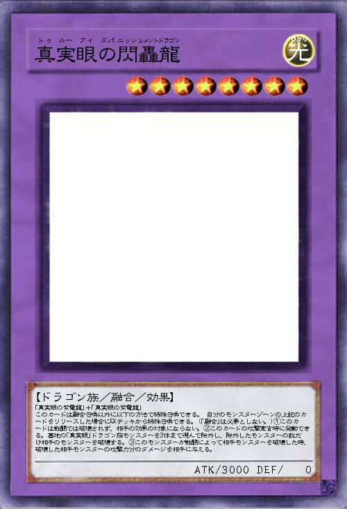 | 「真実眼の紫電龍」+「真実眼の紫電龍」 このカードは融合召喚以外に以下の方法で特殊召喚できる。⚫自分のモンスターゾーンの上記のカードをリリースした場合にEXデッキから特殊召喚できる。(「融合」は必要としない。)①このカードは戦闘では破壊されず、相手の効果の対象にならない。②このカードの攻撃宣言時に発動できる。墓地の「真実眼」ドラゴン族モンスターを3体まで選んで除外し、除外したモンスターの数だけ相手のモンスターを破壊する。③このモンスターが戦闘によって相手モンスターを破壊した時、破壊した相手モンスターの攻撃力分のダメージを相手に与える。 | |||