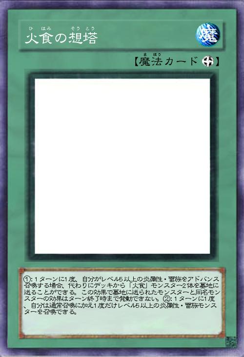| ①:1ターンに1度、自分がレベル5以上の炎属性・雷族をアドバンス召喚する場合、代わりにデッキから「火食」モンスター2体を墓地に送ることができる。この効果で墓地に送られたモンスターと同名モンスターの効果はターン終了時まで発動できない。②:1ターンに1度、自分は通常召喚に加え1度だけレベル5以上の炎属性・雷族モンスターを召喚できる。 | |||