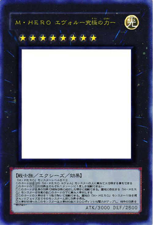 | 「M・HERO」モンスターレベル8×2 このカードは自分の「M・HERO エヴォル」モンスターの上に重ねてX召喚する事もできる このカードの①②の効果はそれぞれ1タンーンに1度しか発動できない ①このカードが自身の効果で特殊召喚に成功した場合に発動できる。墓地に存在する「M・HERO」モンスターを任意の数このカードの下に重ねX素材とする ②このカードのX素材を1つ取り除いて発動できる。墓地の「M・HERO」モンスター1体を選びエンドフェイズまでそのモンスターと同じ効果を得る。 ③X素材を持ったこのモンスターはX素材の数×300ポイント攻撃力がアップし、相手の効果を受けない | |||