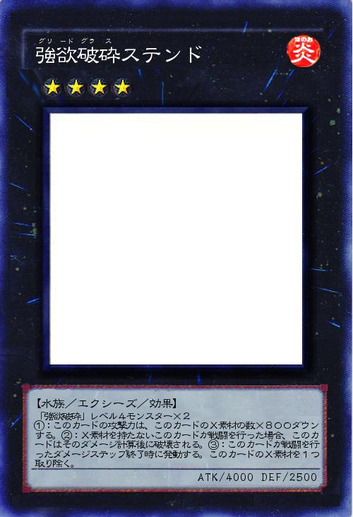 | 「強欲破砕」レベル4モンスター×2 ①:このカードの攻撃力は、このカードのX素材の数×800ダウンする。②:X素材を持たないこのカードが戦闘を行った場合、このカードはそのダメージ計算後に破壊される。③:このカードが戦闘を行ったダメージステップ終了時に発動する。このカードのX素材を1つ取り除く。 | |||