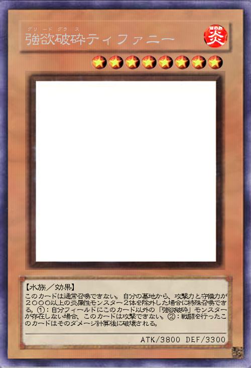 | このカードは通常召喚できない。自分の墓地から、攻撃力と守備力が2000以上の炎属性モンスター2体を除外した場合に特殊召喚できる。①:自分フィールドにこのカード以外の「強欲破砕」モンスターが存在しない場合、このカードは攻撃できない。②:戦闘を行ったこのカードはそのダメージ計算後に破壊される。 | |||