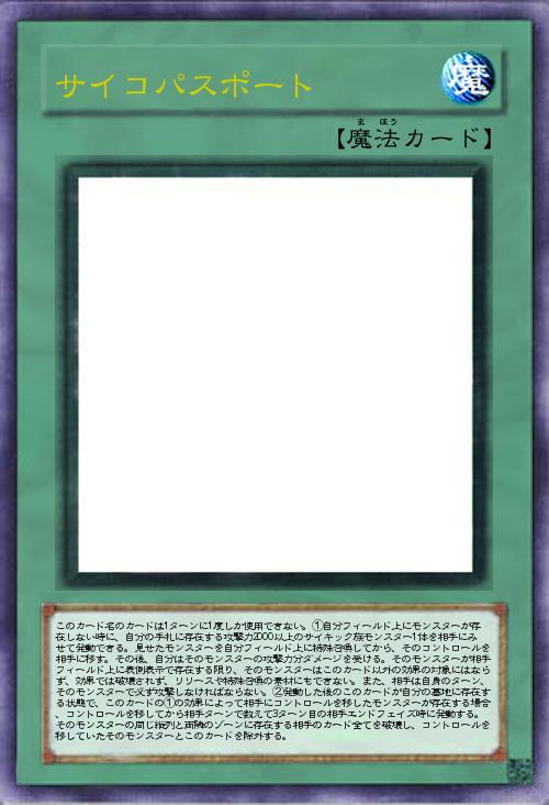 | このカード名のカードは1ターンに1度しか使用できない。①自分フィールド上にモンスターが存在しない時に、自分の手札に存在する攻撃力2000以上のサイキック族モンスター1体を相手にみせて発動できる。見せたモンスターを自分フィールド上に特殊召喚してから、そのコントロールを相手に移す。その後、自分はそのモンスターの攻撃力分ダメージを受ける。そのモンスターが相手フィールド上に表側表示で存在する限り、そのモンスターはこのカード以外の効果の対象にはならず、効果では破壊されず、リリースや特殊召喚の素材にもできない。また、相手は自身のターン、そのモンスターで必ず攻撃しなければならない。②発動した後のこのカードが自分の墓地に存在する状態で、このカードの①の効果によって相手にコントロールを移したモンスターが存在する場合、コントロールを移してから相手ターンで数えて3ターン目の相手エンドフェイズ時に発動する。そのモ | |||