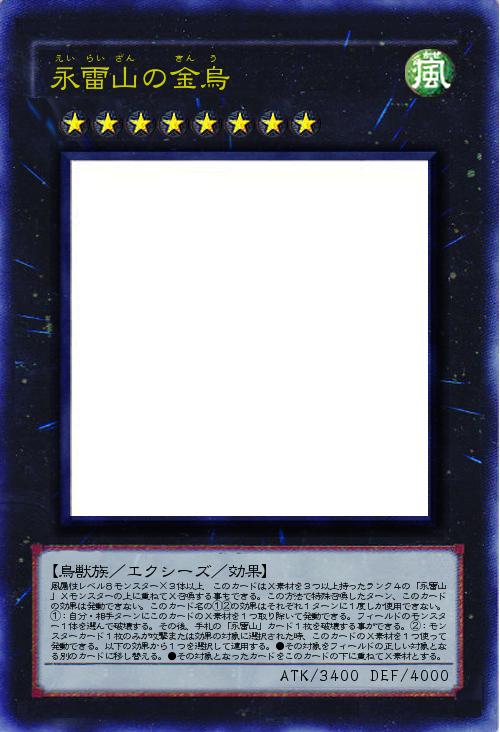 | 風属性レベル8モンスター×3体以上 このカードはX素材を3つ以上持ったランク4の「永雷山」Xモンスターの上に重ねてX召喚する事もできる。この方法で特殊召喚したターン、このカードの効果は発動できない。このカード名の①②の効果はそれぞれ1ターンに1度しか使用できない。①:自分・相手ターンにこのカードのX素材を1つ取り除いて発動できる。フィールドのモンスター1体を選んで破壊する。その後、手札の「永雷山」カード1枚を破壊する事ができる。②:モンスターカード1枚のみが攻撃または効果の対象に選択された時、このカードのX素材を1つ使って発動できる。以下の効果から1つを選択して適用する。●その対象をフィールドの正しい対象となる別のカードに移し替える。●その対象となったカードをこのカードの下に重ねてX素材とする。 | |||