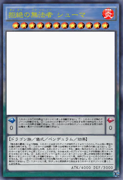 | 「無法者の覇者」により降臨。このカードは自分のライフが相手ライフより1000LP以上低い場合のみ儀式召喚できる。①:このカードは戦闘・効果では破壊されず相手カード効果の対象にならない。②:このカードの儀式召喚に成功した時、お互いのフィールド・手札・墓地・除外されているこのカード以外のカード全てをデッキに戻してシャッフルする。その後お互いのプレイヤーはLPが初期値に戻りデッキから3枚ドローする。③:お互いのプレイヤーはモンスターを1ターンに1度しか特殊召喚できず魔法・罠カードを1ターンに1度しか発動できない。④:1ターンに1度、相手プレイヤーに500のダメージを与える。⑤:このカードの攻撃力以下の攻撃力のモンスターは攻撃できない。⑥:このカードの効果は無効にできない。⑦:1ターンに1度、EXデッキに表側表示で存在するこのカードをPゾーンに置くことができる。 | |||
