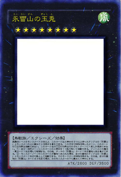 | 風属性レベル8モンスター×3体以上 このカードはX素材を3つ以上持ったランク4の「永雷山」Xモンスターの上に重ねてX召喚する事もできる。この方法で特殊召喚したターン、このカードの①の効果は発動できない。このカード名の①②の効果はそれぞれ1ターンに1度しか使用できない。①:自分・相手ターンにこのカードのX素材を1つ取り除いて発動できる。フィールドの魔法・罠カード1枚を選んで破壊する。その後、デッキの「永雷山」カード1枚を墓地へ送る事ができる。②:モンスターゾーンのこのカードが墓地へ送られた場合、自分の墓地のランク4の「永雷山」Xモンスター1体を対象として発動できる。そのモンスターを特殊召喚する。その後、自分の墓地の「永雷山」カードを3枚まで選び、そのモンスターの下に重ねてX素材とする。 | |||