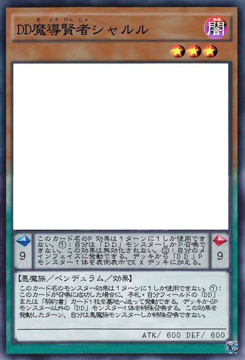 | このカード名のモンスター効果は1ターンに1しか使用できない。①:このカードが召喚に成功した場合に、手札・自分フィールドの「DD」または「契約書」カード1枚を墓地へ送って発動できる。デッキからPモンスター以外の「DD」モンスター1体を特殊召喚する。この効果を発動したターン、自分は悪魔族モンスターしか特殊召喚できない。 | |||