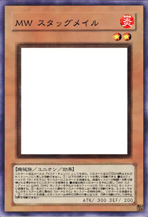 | このカード名はルール上「マスク・チェンジ」としても扱う。このカード名の①②の効果はそれぞれ1タンーンに1度しか発動できない。①:以下の効果から1つを選んで発動できる ●自分フィールドの「M・HERO」モンスターにこのカードを装備する。装備モンスターが戦闘・効果で破壊される場合代わりにこのカードを破壊する ●装備状態のこのカードを手札に戻し「MW スタッグメイル」以外の「MW」モンスターを手札から自分フィールドの「M・HERO」モンスターに装備する。②:自分フィールドに融合モンスターが存在しない場合に発動できる。EXデッキからこのモンスターと同じ属性の「M・HERO」モンスターを特殊召喚し、このカードを装備する。③:このカードを装備したモンスターは相手の効果の対象にならず、効果の発動に対して相手は効果を発動できない | |||