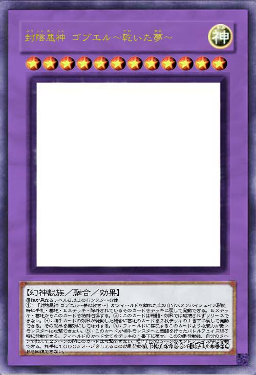 | 属性が異なるレベル5以上のモンスター6体 ①:「封陰悪神 ゴブエル~夢の続き~」がフィールドを離れた次の自分スタンバイフェイズ開始時に手札・墓地・EXデッキ・除外されているそのカードをデッキに戻して発動できる。EXデッキ・墓地からこのカードを特殊召喚する。②:このカードは戦闘・効果では破壊されずリリースできない。③:相手カードの効果が発動した場合に墓地のカードを2枚デッキの1番下に戻して発動できる。その効果を無効にして除外する。④:フィールドに存在するこのカードより攻撃力が低いモンスターは攻撃できない。⑤:このカードが相手モンスターと戦闘を行ったバトルフェイズ終了時に発動できる。フィールドのカード全てをデッキの1番下に戻す。この効果発動後、自分のターンで数えて2ターンの間このカードは攻撃できない。⑥:自分のターンのエンドフェイズ時に発動できる。相手に1000ダメージを与えるこの効果発動後、 | |||