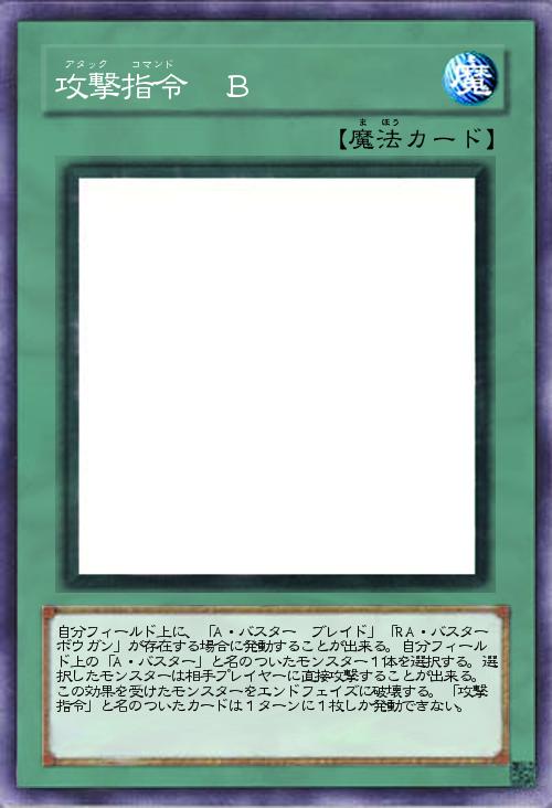 | 自分フィールド上に、「A・バスター ブレイド」「RA・バスター ボウガン」が存在する場合に発動することが出来る。自分フィールド上の「A・バスター」と名のついたモンスター1体を選択する。選択したモンスターは相手プレイヤーに直接攻撃することが出来る。この効果を受けたモンスターをエンドフェイズに破壊する。「攻撃指令」と名のついたカードは1ターンに1枚しか発動できない。 | |||