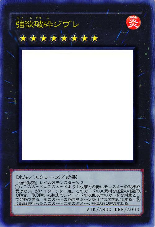 | 「強欲破砕」レベル8モンスター×2 ①:このカードはこのカードよりも攻撃力の低いモンスターの効果を受けない。②:1ターンに1度、このカードのX素材を任意の枚数取り除き、取り除いた数までフィールドの表側表示のカードを対象として発動できる。そのカードの効果をターン終了時まで無効化する。③:戦闘を行ったこのカードはそのダメージ計算後に破壊される。 | |||