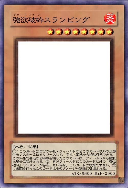 | ①:このカードは自分の手札・フィールドからこのカード以外の炎属性モンスター2体をリリースして、手札・墓地から特殊召喚できる。この効果で墓地から特殊召喚したこのカードは、フィールドから離れた場合に除外される。②:自分フィールドにこのカード以外の「強欲破砕」モンスターが存在しない場合、このカードは攻撃できない。③:戦闘を行ったこのカードはそのダメージ計算後に破壊される。 | |||