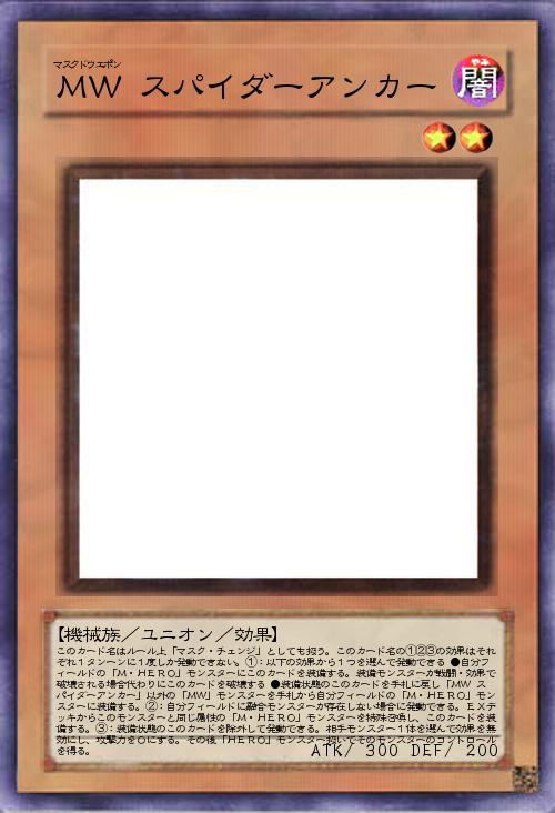 | このカード名はルール上「マスク・チェンジ」としても扱う。このカード名の①②③の効果はそれぞれ1タンーンに1度しか発動できない。①:以下の効果から1つを選んで発動できる ●自分フィールドの「M・HERO」モンスターにこのカードを装備する。装備モンスターが戦闘・効果で破壊される場合代わりにこのカードを破壊する ●装備状態のこのカードを手札に戻し「MW スパイダーアンカー」以外の「MW」モンスターを手札から自分フィールドの「M・HERO」モンスターに装備する。②:自分フィールドに融合モンスターが存在しない場合に発動できる。EXデッキからこのモンスターと同じ属性の「M・HERO」モンスターを特殊召喚し、このカードを装備する。③:装備状態のこのカードを除外して発動できる。相手モンスター1体を選んで効果を無効にし、攻撃力を0にする。その後「HERO」モンスター扱いでそのモンスターのコントロールを得る。 | |||