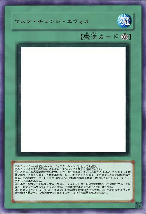 | このカードのカード名はルール上「マスク・チェンジ」としても扱う。 このカード名の①②の効果はそれぞれ1タンーンに1度しか発動できない。 ①:このカードの発動時の効果処理として、自分の手札・フィールドから「MW」モンスターを墓地に送り、そのモンスターと同じ属性の「M・HERO」モンスターをEXデッキから特殊召喚できる。この効果で「M・HERO エヴォル」を特殊召喚する場合、墓地に送るモンスターをデッキから選ぶ事が出来る。 ②:墓地・除外ゾーンに存在する「マスク・チェンジ」カード3枚を対象として発動できる。そのカードをデッキに戻してシャッフルする。その後自分はデッキから1枚ドローする。 ③:自分フィールドに「マスク・チェンジ」の効果で特殊召喚されたモンスターが存在する限り自分の魔法・罠ゾーンに表側表示で存在するカードは相手の効果で破壊されない。 | |||