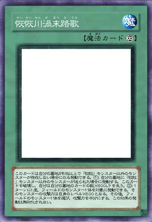| このカードは自分の墓地が8枚以上で「恢恢」モンスター以外のモンスターが存在しない場合にのみ発動できる。①:自分の墓地に「恢恢」モンスター以外のモンスターが送られた場合に発動する。このカードを破壊し、自分は自分の墓地のカードの数×600LPを失う。②:1ターンに1度、フィールドのモンスター1体を対象に発動できる。そのモンスターの攻撃力は自身のレベル×500となる。その後、フィールドのモンスター1体を選び、攻撃力を半分にする。この効果の発動は無効化されない。 | |||