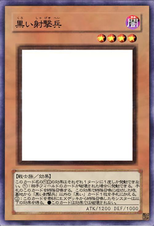 | このカード名の①②の効果はそれぞれ1ターンに1度しか発動できない。①:相手フィールドのカードが破壊された場合に発動できる。手札のこのカードを特殊召喚する。この効果で特殊召喚に成功した時、墓地から「黒い射撃兵」以外の「黒い」カード1枚を手札に加える。②:このカードを素材にEXデッキから特殊召喚したモンスターは以下の効果を得る。●このカードは効果では破壊されない。 | |||
