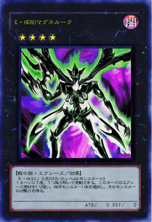 | 「E・HERO」と名の付いたレべル4モンスター×3 1ターンに1度、1つ取り除いて発動できる。このカードのエクシーズ素材を1つ使い、相手モンスター1体を選択し、そのモンスターの功撃力を得る。 | |||