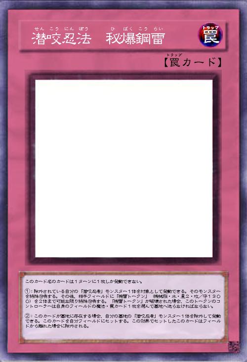 | このカード名のカードは1ターンに1枚しか発動できない。 ①:除外されている自分の「潜咬忍者」モンスター1体を対象として発動できる。そのモンスターを特殊召喚する。その後、相手フィールドに「機雷トークン」(機械族・水・星2・攻/守1300)を2体まで可能な限り特殊召喚する。「機雷トークン」が破壊された場合、このトークンのコントローラーは自身のフィールドの魔法・罠カード1枚を選んで墓地へ送らなければならない。 ②:このカードが墓地に存在する場合、自分の墓地の「潜咬忍者」モンスター1体を除外して発動できる。このカードを自分フィールドにセットする。この効果でセットしたこのカードはフィールドから離れた場合に除外される。 | |||