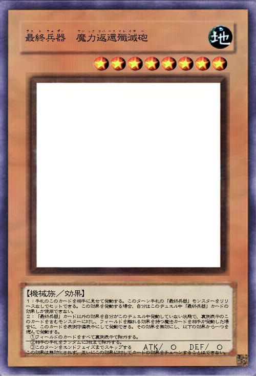| 1:手札のこのカードを相手に見せて発動する。このターン手札の「最終兵器」モンスターをリリースなしでセットできる。この効果を発動する場合、自分はこのデュエル中「最終兵器」カードの効果しか使用できない。 2:「最終兵器」カード以外の効果を自分がこのデュエル中発動していない状態で、裏側表示のこのカードを含むモンスターに対し、フィールドを離れる効果を持つ魔法カードを相手が発動した場合に、このカードを表側守備表示にして発動できる。その効果を無効にし、以下の効果から一つを選んで発動する。 ①フィールドのカードをすべて裏側表示で除外する。 ②相手の手札をランダムに3枚まで除外する。 ③このターンをエンドフェイズまでスキップする この効果は無効化されず、互いにこの効果に対してカードの効果をチェーンすることはできない。 | |||