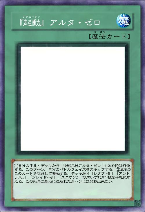 | ①自分の手札・デッキから「決戦兵器アルタ・ゼロ」1体を特殊召喚する。このターン、自分のバトルフェイズをスキップする。②墓地のこのカードを除外して発動する。デッキから「レダクトR」「アンドラスL」「ブレイザーS」「ユニオンC」の内いずれか1枚を手札に加える。この効果は墓地に送られたターンには発動出来ない。 | |||