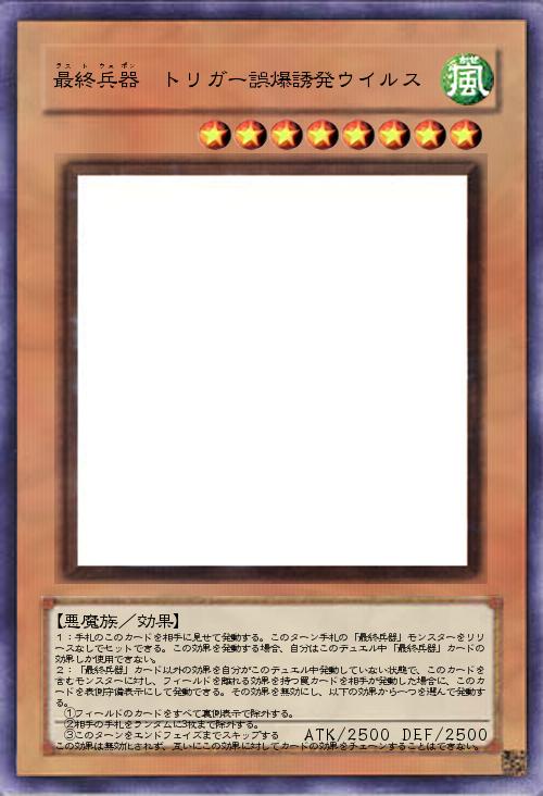 | 1:手札のこのカードを相手に見せて発動する。このターン手札の「最終兵器」モンスターをリリースなしでセットできる。この効果を発動する場合、自分はこのデュエル中「最終兵器」カードの効果しか使用できない。 2:「最終兵器」カード以外の効果を自分がこのデュエル中発動していない状態で、裏側表示のこのカードを含むモンスターに対し、フィールドを離れる効果を持つ罠カードを相手が発動した場合に、このカードを表側守備表示にして発動できる。その効果を無効にし、以下の効果から一つを選んで発動する。 ①フィールドのカードをすべて裏側表示で除外する。 ②相手の手札をランダムに3枚まで除外する。 ③このターンをエンドフェイズまでスキップする この効果は無効化されず、互いにこの効果に対してカードの効果をチェーンすることはできない。 | |||