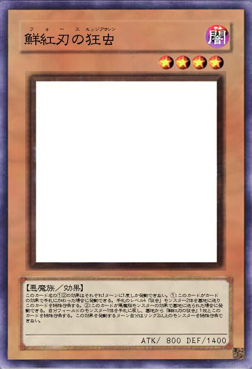 | このカード名の①②の効果はそれぞれ1ターンに1度しか発動できない。①:このカードがカードの効果で手札に加わった場合に発動できる。手札のレベル4「狂虫」モンスター2体を墓地に送りこのカードを特殊召喚する。②:このカードが悪魔族モンスターの効果で墓地に送られた場合に発動できる。自分フィールドのモンスター1体を手札に戻し、墓地から「鮮紅刃の狂虫」1枚とこのカードを特殊召喚する。この効果を発動するターン自分はリンク2以上のモンスターを特殊召喚できない。 | |||