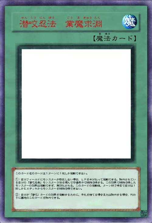| このカード名のカードは1ターンに1枚しか発動できない。 ①:自分フィールドにモンスターが存在しない場合、LPを半分払って発動できる。除外されている自分の「潜咬忍者」モンスター3体を選んで守備表示で特殊召喚する。この効果で特殊召喚したモンスターの効果は発動できず、無効化される。このカードの発動後、ターン終了時まで自分は1回しかEXデッキからモンスターを特殊召喚できない。 ②:自分が「潜咬」カードの効果を発動するために、手札を捨てる場合または除外する場合、代わりに墓地のこのカードを除外できる。 | |||