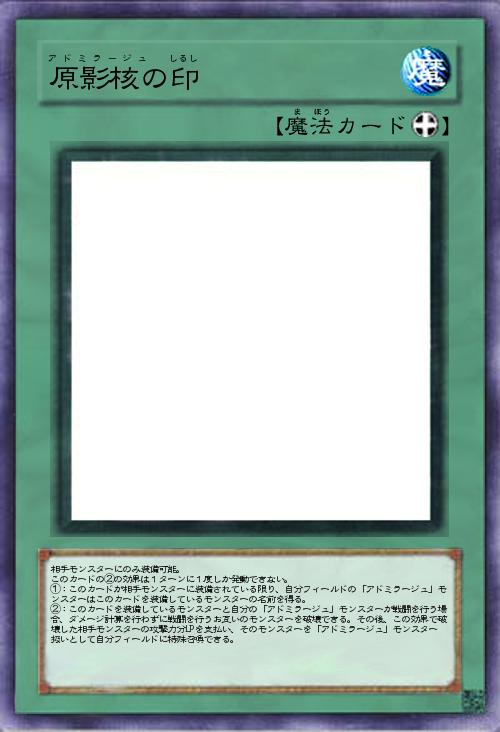 | 相手モンスターにのみ装備可能。 このカードの②の効果は1ターンに1度しか発動できない。 ①:このカードが相手モンスターに装備されている限り、自分フィールドの「アドミラージュ」モンスターはこのカードを装備しているモンスターの名前を得る。 ②:このカードを装備しているモンスターと自分の「アドミラージュ」モンスターが戦闘を行う場合、ダメージ計算を行わずに戦闘を行うお互いのモンスターを破壊できる。その後、この効果で破壊した相手モンスターの攻撃力分LPを支払い、そのモンスターを「アドミラージュ」モンスター扱いとして自分フィールドに特殊召喚できる。 | |||