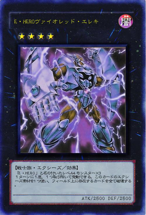 | 「E・HERO」と名の付いたレべル4モンスター×3 1ターンに1度、1つ取り除いて発動できる。このカードのエクシーズ素材を1つ使い、フィールド上に存在するカードを全て破壊する。 | |||