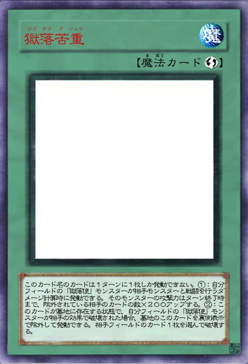 | このカード名のカードは1ターンに1枚しか発動できない。①:自分フィールドの「獄落使」モンスターが相手モンスターと戦闘を行うダメージ計算時に発動できる。そのモンスターの攻撃力はターン終了時まで、除外されている相手のカードの数×200アップする。②:このカードが墓地に存在する状態で、自分フィールドの「獄落使」モンスターが相手の効果で破壊された場合、墓地のこのカードを裏側表示で除外して発動できる。相手フィールドのカード1枚を選んで破壊する。 | |||