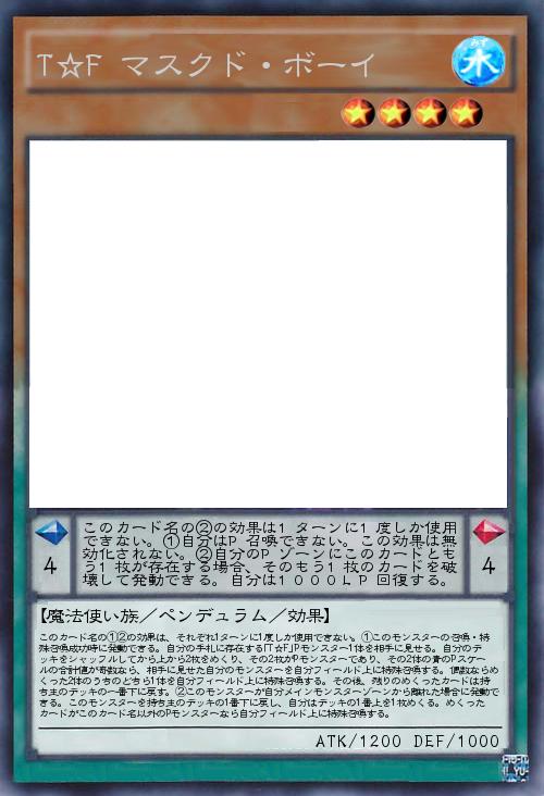 | このカード名の①②の効果は、それぞれ1ターンに1度しか使用できない。①このモンスターの召喚・特殊召喚成功時に発動できる。自分の手札に存在する「T☆F」Pモンスター1体を相手に見せる。自分のデッキをシャッフルしてから上から2枚をめくり、その2枚がPモンスターであり、その2体の青のPスケールの合計値が奇数なら、相手に見せた自分のモンスターを自分フィールド上に特殊召喚する。偶数ならめくった2体のうちのどちら1体を自分フィールド上に特殊召喚する。その後、残りのめくったカードは持ち主のデッキの一番下に戻す。②このモンスターが自分メインモンスターゾーンから離れた場合に発動できる。このモンスターを持ち主のデッキの1番下に戻し、自分はデッキの1番上を1枚めくる。めくったカードがこのカード名以外のPモンスターなら自分フィールド上に特殊召喚する。 | |||