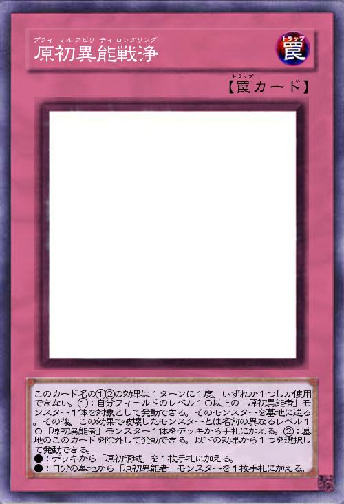 | このカード名の①②の効果は1ターンに1度、いずれか1つしか使用できない。①:自分フィールドのレベル10以上の「原初異能者」モンスター1体を対象として発動できる。そのモンスターを墓地に送る。その後、この効果で破壊したモンスターとは名前の異なるレベル10「原初異能者」モンスター1体をデッキから手札に加える。②:墓地のこのカードを除外して発動できる。以下の効果から1つを選択して発動できる。 ●:デッキから「原初領域」を1枚手札に加える。 ●:自分の墓地から「原初異能者」モンスターを1枚手札に加える。 | |||
