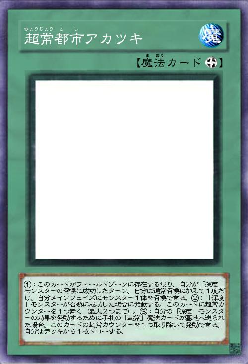 | ①:このカードがフィールドゾーンに存在する限り、自分が「深度」モンスターの召喚に成功したターン、自分は通常召喚に加えて1度だけ、自分メインフェイズにモンスター1体を召喚できる。②:「深度」モンスターが召喚に成功した場合に発動する。このカードに超常カウンターを1つ置く(最大2つまで)。③:自分の「深度」モンスターの効果を発動するために手札の「超常」魔法カードが墓地へ送られた場合、このカードの超常カウンターを1つ取り除いて発動できる。自分はデッキから1枚ドローする。 | |||
