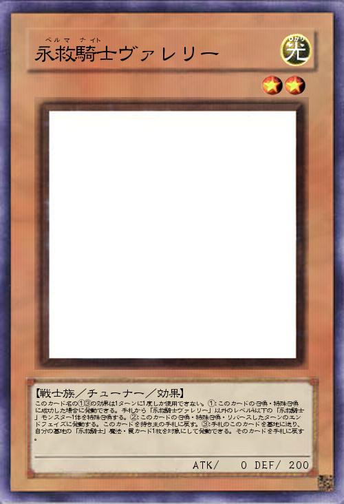 | このカード名の①③の効果は1ターンに1度しか使用できない。①:このカードの召喚・特殊召喚に成功した場合に発動できる。手札から「永救騎士ヴァレリー」以外のレベル4以下の「永救騎士」モンスター1体を特殊召喚する。②:このカードの召喚・特殊召喚・リバースしたターンのエンドフェイズに発動する。このカードを持ち主の手札に戻す。③:手札のこのカードを墓地に送り、自分の墓地の「永救騎士」魔法・罠カード1枚を対象にして発動できる。そのカードを手札に戻す。 | |||
