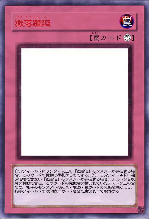 | 自分フィールドにリンク4以上の「獄落使」モンスターが存在する場合、このカードの発動は手札からもできる。①:自分フィールドに通常召喚できない「獄落使」モンスターが存在する場合、チェーン3以降に発動できる。このカードの発動時に積まれていたチェーン上の全ての、相手のモンスターの効果・魔法・罠カードの発動を無効にし、相手フィールドの表側表示カードを全て裏側表示で除外する。 | |||