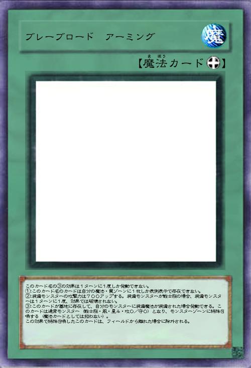 | このカード名の③の効果は1ターンに1度しか発動できない。 ①:このカード名のカードは自分の魔法・罠ゾーンに1枚しか表側表示で存在できない。 ②:装備モンスターの攻撃力は700アップする。装備モンスターが戦士族の場合、装備モンスターは1ターンに1度、効果では破壊されない。 ③:このカードが墓地に存在して、自分のモンスターに装備魔法が装備された場合発動できる。このカードは通常モンスター(戦士族・風・星4・攻0/守0)となり、モンスターゾーンに特殊召喚する(魔法カードとしては扱わない)。 この効果で特殊召喚したこのカードは、フィールドから離れた場合に除外される。 | |||