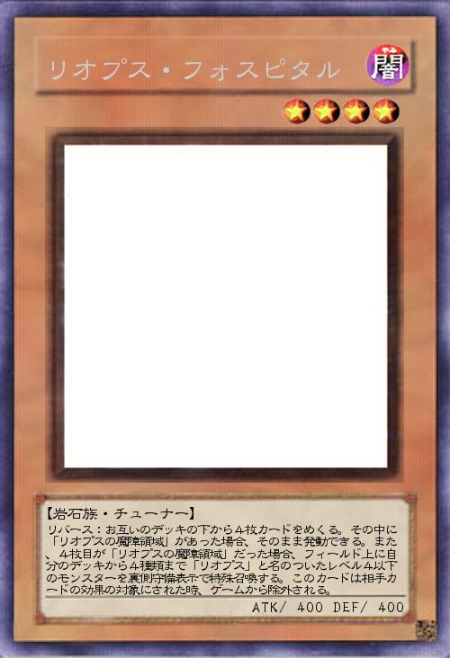 | リバース:お互いのデッキの下から4枚カードをめくる。その中に「リオプスの魔障領域」があった場合、そのまま発動できる。また、4枚目が「リオプスの魔障領域」だった場合、フィールド上に自分のデッキから4種類まで「リオプス」と名のついたレベル4以下のモンスターを裏側守備表示で特殊召喚する。このカードは相手カードの効果の対象にされた時、ゲームから除外される。 | |||