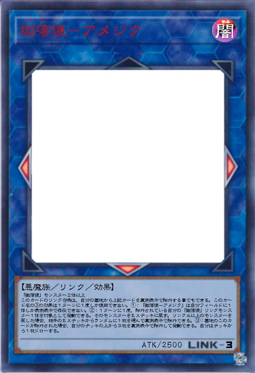 | 「獄落使」モンスター2体以上 このカードのリンク召喚は、自分の墓地から上記カードを裏側表示で除外する事でもできる。このカード名の③の効果は1ターンに1度しか使用できない。①:「獄落使-アメジク」は自分フィールドに1体しか表側表示で存在できない。②:1ターンに1度、除外されている自分の「獄落使」リンクモンスター1体を対象として発動できる。そのモンスターをEXデッキに戻す。リンク4以上のモンスターを戻した場合、相手のEXデッキからランダムに1枚を選んで裏側表示で除外できる。③:墓地のこのカードが除外された場合、自分のデッキの上から3枚を裏側表示で除外して発動できる。自分はデッキから1枚ドローする。 | |||